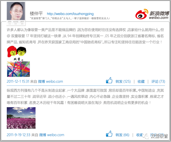 我有一個比較好的習(xí)慣就是愿意不斷地學(xué)習(xí),我盯住一件事情就會持續(xù)去關(guān)注其發(fā)展動態(tài)并做長遠(yuǎn)的規(guī)劃,我覺得我們的品牌塑造也是一個由低級到高級的運(yùn)作過程,積累初期因?yàn)闆]有經(jīng)驗(yàn),只能選擇在一些書刊和戶外廣告的途徑做一些簡單的廣告推廣,之后我們利用互聯(lián)網(wǎng)優(yōu)勢取得突破。再之是致力于企業(yè)的亮點(diǎn),利用社會化媒體密集傳播而形成口碑傳播??梢哉f“雙童吸管”的馳名商標(biāo)認(rèn)定,幾乎不靠廣告推廣,前后十五年的時間,直接的廣告支出幾乎不超過五百萬,而省下來的大部分經(jīng)費(fèi)都花到企業(yè)文化的價值觀塑造和傳播上。