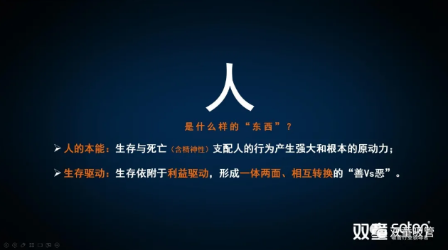 在課程分享伊始,樓老師首先通過人性的角度,讓同學們認知“人是一個什么樣的東西”?