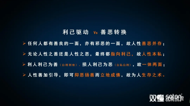 從上圖中大家可以看到,無論人性之善還是人性之惡,其實都包含“利己驅動”。“利己”是人在長期的自然環(huán)境中為了獲得生存不得不獲得更多外部資源的內在驅動力,從而導致人總是會從利己的角度去考慮如何更快、更多的獲得。所以“人性本私”是無可非議的。