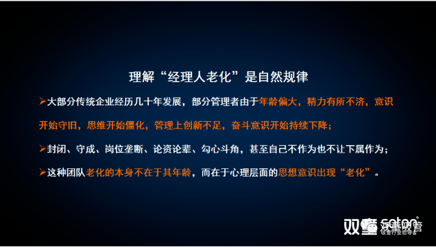 接下來,樓老師通過“雙童”十年前的案例闡述“雙童”遇到的“經理人老化”問題: