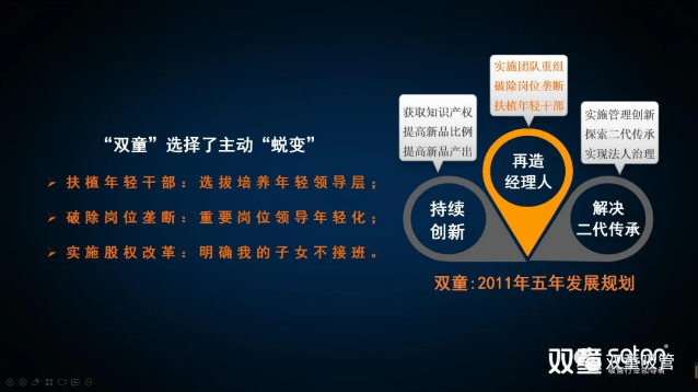 2010年,樓仲平在理解人性活力的“自然遞減”的現(xiàn)象以及經理人老化自然規(guī)律后,下定決心通過《雙童五年發(fā)展規(guī)劃》的組織變革來實施解決“經理人老化”問題:明確扶植年輕干部,選拔培養(yǎng)優(yōu)秀的年輕領導層,解決二代傳承接班等問題。這次重大的組織變革在完成之后的許多年,樓老師都坦言“做錯了”,做錯了不在于組織變革本身,而在于事后的巨大波折讓樓老師理解到不能用西方管理學教條來簡單解決高度復雜的中國職場的人際關系。雖然雙童的這次重大組織變革在2013年10月完成,但變革期間備受波折,也付出了巨大的代價。