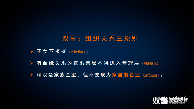 雙童在組織變革后明確形成了“組織關系三原則”,很多人不理解樓老師在十年前做出的“子女不接班”這樣的傳承安排,樓老師引導大家在傳承問題上沒有絕對的答案,雙童不讓子女接班并非我大公無私,而是運用經濟學的“比較優(yōu)勢”原理充分酌量后選擇的結果,是綜合考慮了子女的喜好、擅長、愿景后而得出的合理安排。當然期間隱含的信號卻發(fā)出了巨大的想象空間。大家想想,在一家經營了近二十年的傳統(tǒng)制造企業(yè)里面:
