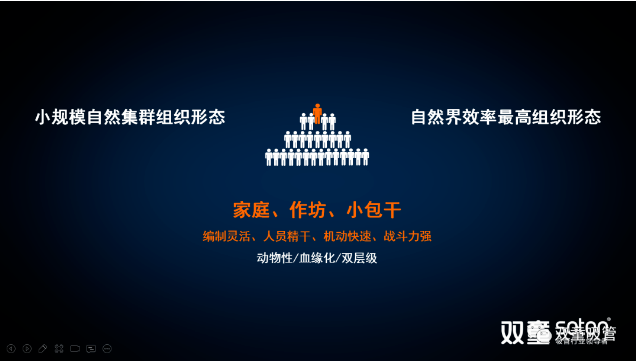 樓老師通過蟻群、猴群、魚群等自然界案例和思維邏輯圖,向大家展現(xiàn)了自然界當中普遍存在的自然組織形態(tài)。這種基于動物性、血緣化本能而形成的雙層結構的組織形式由于其編制靈活、人員精干、機動快速而戰(zhàn)斗力強,是自然界當中存在億萬年之久的十分高效的組織形態(tài)。