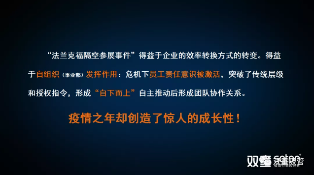 隨后,樓老師通過“法蘭克福隔空參展事件”,讓大家深刻意識到這種機制催生的巨大活力?!半p童”第三事業(yè)部在2020年2月疫情危機下,自主經營的員工責任意識被激活,在眾多不利環(huán)境下突破了傳統(tǒng)層級和授權指令,實現(xiàn)“自下而上”推動后形成了緊密的團隊協(xié)作關系。在眼看參展無望的絕境下竭盡所能,核心成員通過創(chuàng)新方式和遠程視頻遙控的方式聘請德國慕尼黑工業(yè)大學的留學生全程參展,從而獲得了五年以來最好的參展效果,在疫情之年取得了驚人的成長性。