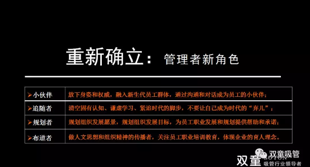 最后樓老師針對上述組織變革提出了管理者角色的重新定位,他認為傳統(tǒng)經營者和管理者如果還在堅持沿用以前的老經驗、老方式,那就離淘汰不遠了!樓老師也再次提醒大家,面對不同的價值個體,管理者首先需要改變的就是自己: