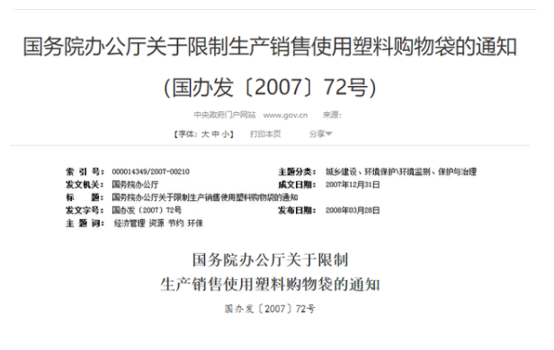 2007年12月31日,《國務院辦公廳關于限制生產銷售使用塑料購物袋的通知》發(fā)布。