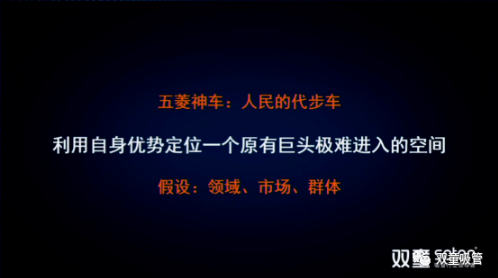 那么它運用的是什么原理呢?大家不妨思考一下! 是升維拆解嗎?顯然不是!這實際上是通過假設(shè)挖掘出一個更為底層的主流消費群體,滿足了大眾更為廣泛的需求,從而在原有市場之外找到了自己的生態(tài)位,建立起自身獨特的創(chuàng)新模式,那么這種模式就是“降維拆解”。 所以,五菱宏光MINI電動車的廣告詞非常精準,叫做“人民的代步車”,人民就是它的認知前提,代步車是它的產(chǎn)品消費定位群體,利用自身優(yōu)勢定位一個原有巨頭極難進入的空間,從而打開新的市場。