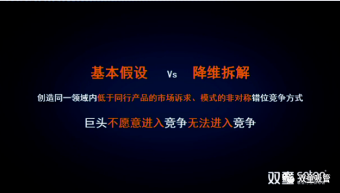 所謂“降維拆解”并非降低產(chǎn)品的技術(shù),更非粗制濫造,而是發(fā)掘底層消費群體更為廣泛的大眾需求,從而實現(xiàn)市場占有的快速提升,本質(zhì)上就是錯位競爭,在看似一片紅海中尋找到自己的產(chǎn)業(yè)生態(tài)位。 實際上,錯位競爭的本質(zhì)就是尋找到非對稱創(chuàng)造商業(yè)機會。而所謂錯位,是需要我們在經(jīng)營上撇開大家都能看到的機會,繞開我們習慣依賴的經(jīng)驗主義,避開多數(shù)人在走的尋常路,從而另辟蹊徑,去創(chuàng)造同一領(lǐng)域內(nèi)高于同行產(chǎn)品的技術(shù)、需求、模式的非對稱創(chuàng)新競爭方式。