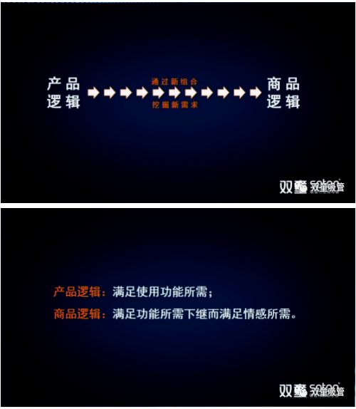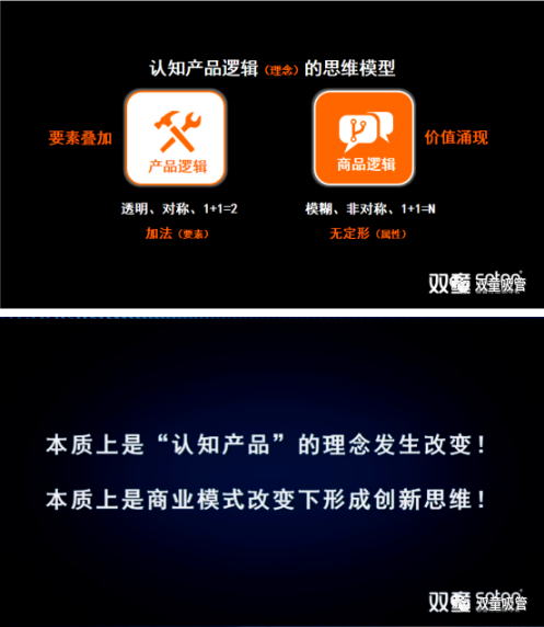 簡單來說,產(chǎn)品邏輯是要素的“疊加之和”,是1+1=2,是成本疊加再加上合理利潤的預(yù)期值。所以,透明、對稱,你與競爭對手之間是完全的正面競爭。而商品邏輯是非對稱的,它隱含的競爭要素更多體現(xiàn)在人文性和精神性上,如品牌、渠道、技術(shù)和體驗服務(wù)上,從而讓競爭對手無法復(fù)制,由此產(chǎn)生非對稱競爭,以實現(xiàn)更大的價值創(chuàng)造。