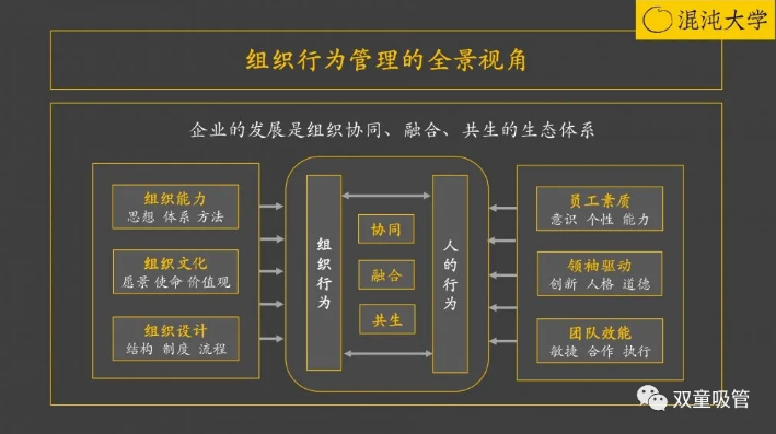 要回歸到一個企業(yè)發(fā)展的愿景,從人的本性出發(fā),關(guān)注于人在組織上的管理。戰(zhàn)略性的組織管理要從治理結(jié)構(gòu)的角度出發(fā),通過搭建利益分配機(jī)制和文化價值體系,以文化為核心,以統(tǒng)一的價值觀聚合人力資本,以領(lǐng)袖來驅(qū)動組織的成長。