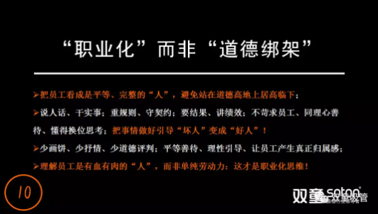 在“理性”思維的持續(xù)引導(dǎo)下,“雙童”在文化中倡導(dǎo)把員工看成是平等、完整的“人”,而非站在道德高地上居高臨下,處處體現(xiàn)尊重、公平和雙贏。我們理解員工是有血有肉的“人”,而非單純的勞動(dòng)力,對(duì)待員工少“畫餅”,少抒情,懂得換位思考,不去“道德綁架”員工,才能讓員工真正產(chǎn)生歸屬感。