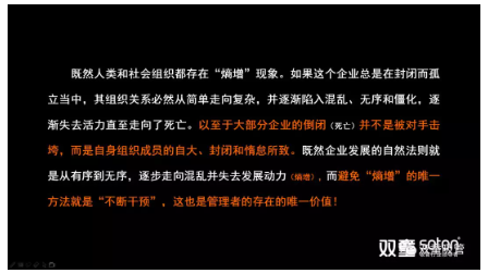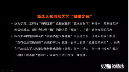 “熵”,是來自于物理學(xué)熱力學(xué)第二定律的一個詞。“熵增定律”意指在任何“孤立而封閉”系統(tǒng)中,其系統(tǒng)無序度必然增加,最終會達(dá)到“熵”的最大值“死寂”。簡單理解就是:任何一個人,任何一個組織,乃至于任何一個家庭,如果你把自己封閉起來,你的內(nèi)部一定是從有序到無序。如果你繼續(xù)封閉,它的混亂程度一定會達(dá)到最大值,一直到死寂。“雙童”樓仲平也曾多次在課程分享中引用熱力學(xué)第二定律的“熵增定律”,把“雙童”存在的問題通過自然的現(xiàn)象加以挖掘、頗析、呈現(xiàn)、對照,從而來尋求問題解決的方法。樓仲平分享的“熵增定律”PPT頁面