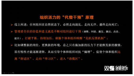 對于企業(yè)而言其實(shí)也是如此,如果一個企業(yè)總是在封閉而孤立當(dāng)中,其組織關(guān)系也必然從簡單走向復(fù)雜,并逐漸陷入混亂、無序和僵化,逐漸失去活力直至走向了“死亡”。而避免“熵增”的唯一方法就是管理者持續(xù)開放和組織干預(yù),從而打破平衡,持續(xù)加壓、刺激個體和組織喚醒“危機(jī)反饋機(jī)制”,從而讓個體和組織遠(yuǎn)離“舒適區(qū)”,走向“學(xué)習(xí)區(qū)”,進(jìn)入“恐慌區(qū)”,原有惰性才能逐漸逆轉(zhuǎn),從而煥發(fā)出新的活力!樓仲平分享的“熵增定律”PPT頁面