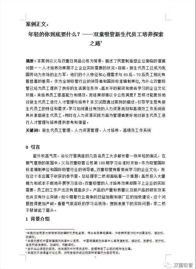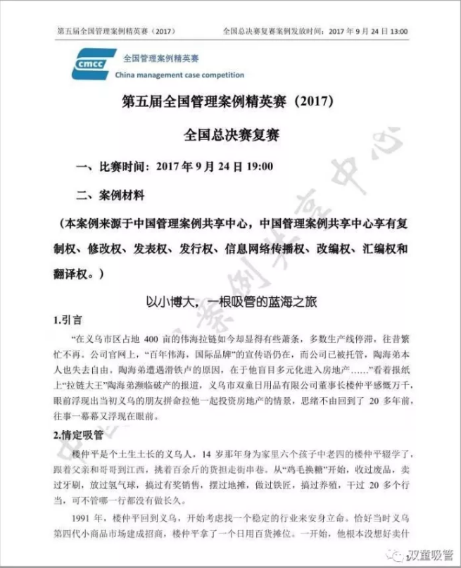 截止到目前,以“雙童”為主題的案例進(jìn)入到國家案例庫的數(shù)量就高達(dá)5件。其中南京商學(xué)院研究案例《年輕的你到底要什么?——雙童吸管新生代員工培養(yǎng)探索之路》、浙江工業(yè)大學(xué)研究案例《以小博大,一根吸管的藍(lán)海之旅》兩件研究案例更是被評(píng)為了2016年度百優(yōu)案例!浙江工業(yè)大學(xué)研究案例《以小博大,一根吸管的藍(lán)海之旅》還成為了2017年精英賽總決賽的案例!