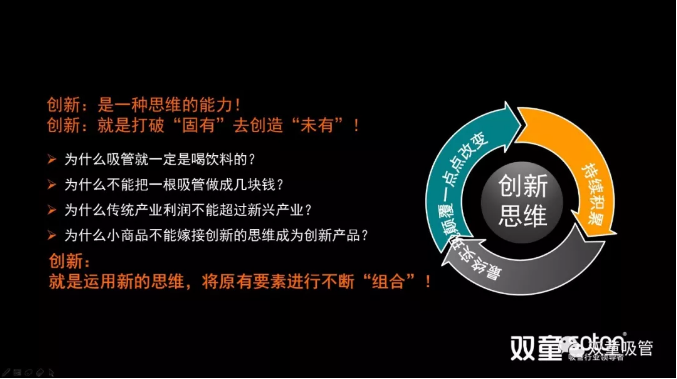 現(xiàn)在,不少人動(dòng)不動(dòng)就喊要?jiǎng)?chuàng)新,但是到底什么是創(chuàng)新?我一直理解創(chuàng)新工作的本質(zhì)在于“思維創(chuàng)新”,就是運(yùn)用新的思維,將原有要素進(jìn)行不斷“組合”,打破“固有”創(chuàng)造“未有”。只有用創(chuàng)新思維去做產(chǎn)品、做事業(yè),才能改變自己乃至于整個(gè)企業(yè)的命運(yùn)!