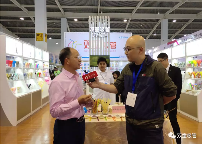 “雙童”展位的門前,除了來往賓客,還有各大媒體前來探訪。關(guān)于“一根吸管”的奧秘,廣大媒體朋友都抱以極大的好奇,“雙童”的當(dāng)家人樓仲平也會在展位上為他們一一解答所有的疑問。