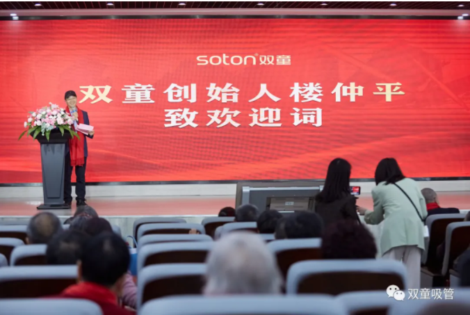 參觀完廠區(qū),家人們一起來到大會(huì)堂,樓仲平為大家致歡迎詞。他深情地對(duì)村里的長輩家人表示感謝: