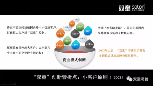 “雙童”的“兩條腿走路”戰(zhàn)略,既保留了一部分有合理利潤(rùn)的長(zhǎng)期訂單,又開(kāi)拓了個(gè)性化、精細(xì)化的小客戶,大幅提升了客戶數(shù)量,拓寬了產(chǎn)品經(jīng)營(yíng)廣度,經(jīng)營(yíng)風(fēng)險(xiǎn)大大下降,從而掌握了企業(yè)的經(jīng)營(yíng)主動(dòng)權(quán),促進(jìn)了企業(yè)的研發(fā)創(chuàng)新能力,帶動(dòng)了“雙童”品牌的不斷提升。