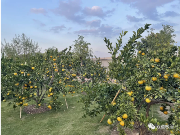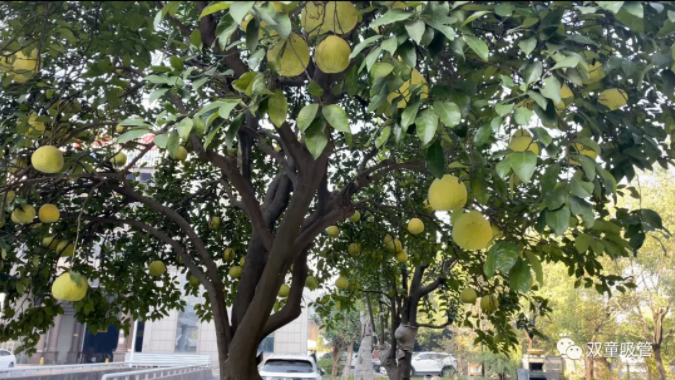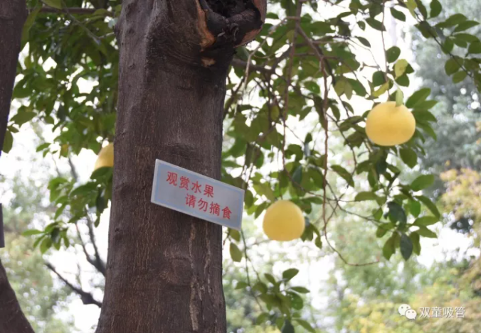 為了“雙童”的生態(tài)和美觀,公司明確柚子是觀賞性水果。成長過程中柚子可以一直掛在樹上觀賞一直到第二年四月,六月份開始新的柚子又長成了,一年掛果十個月!每棵柚子樹上都有“觀賞水果,請勿摘食”的字樣,提醒和引導員工不要摘食觀賞水果。