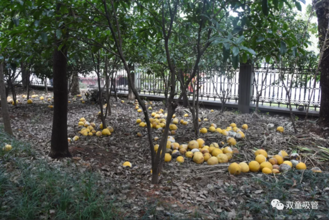 掉落的柚子堆在小樹林里進行發(fā)酵