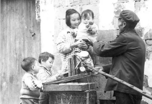 義烏貨郎收雞毛中 “雞毛換糖”換來的雞毛由于數(shù)量較多要等到火車托運回來后交給生產(chǎn)隊記工分(以前農(nóng)村考核社員的一種計分)而充當副業(yè)費。父親回來后我會整天跟著他到農(nóng)村市口去換山貨,每次換山貨后等待的就是爸爸肯定會買一個只有這個時候才能吃到的麻餅。三兄弟中我最小,我一直以來感覺爸爸也最疼我,這是我記憶中最最幸福的事情。