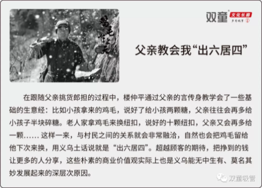 跟隨著爸爸挑貨郎擔(dān)的過程當(dāng)中,我也學(xué)到了很多東西。 比如說,在換雞毛時,原本給小孩兩顆糖,爸爸會再多給小孩半塊碎掉的糖;有些人過來換紐扣,原本說好十顆紐扣,爸爸會再多給一顆…… 這樣一來,村民們就會記得我們的好,就算下次別的貨郎經(jīng)過這里,他們也不會把雞毛給別人,而是留著給我們。 后來我才理解這是義烏商人特有的品質(zhì),用義烏土話說就是“出六居四”,做生意多給別人一些,要先想別人(利他經(jīng)營),超越顧客的期待,讓顧客占點便宜,別人才會更愿意和你做生意,生意才會越做越好。 雖然現(xiàn)在義烏人早已不從事“雞毛換糖”,但無論做生意還是辦企業(yè),都延續(xù)了這一價值觀,這實際上也是義烏能發(fā)展得越來越好的深層原因。