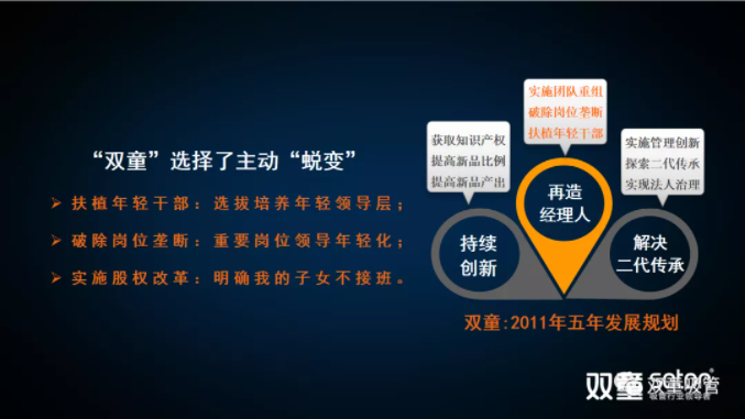 2010年底開始,“雙童”中高層管理團(tuán)隊(duì)便被要求一起學(xué)習(xí)德魯克思想,通過(guò)共同學(xué)習(xí)的方式,促進(jìn)德魯克思想在經(jīng)營(yíng)層面的管理實(shí)踐。在之后短短三年時(shí)間里,“雙童”確立“再造經(jīng)理人”制度,催生出新生代經(jīng)理人團(tuán)隊(duì),到確立法人治理、建立企業(yè)傳承的機(jī)制,推動(dòng)“雙童”從家庭作坊到現(xiàn)代化企業(yè)徹底轉(zhuǎn)型。