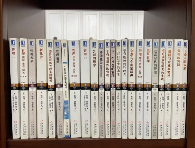 樓仲平書架上擺滿了德魯克的書