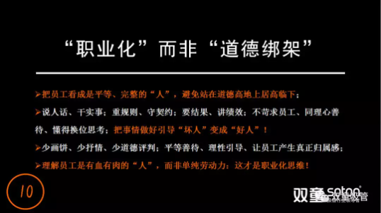在“理性”思維的持續(xù)引導(dǎo)下,“雙童”在文化中倡導(dǎo)把員工看成是平等、完整的“人”,而非站在道德高地上居高臨下,處處體現(xiàn)尊重、公平和雙贏。我們理解員工是有血有肉的“人”,而非單純的勞動力,對待員工少“畫餅”,少抒情,懂得換位思考,不去“道德綁架”員工,才能讓員工真正產(chǎn)生歸屬感。