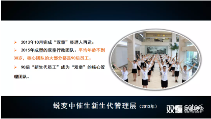 同時,年輕人也能夠得到重用,2013年,“雙童”在完成團隊重組之后,團隊平均年齡不到30歲,大部分都是90后,在制造業(yè)企業(yè)來說,是屬于少有的管理年輕化。