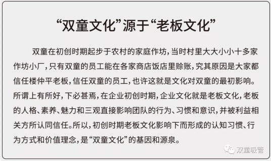 深究這其中的原因,都是大家對(duì)樓仲平的信任,從而對(duì)“雙童”的員工也產(chǎn)生了信任,最初的企業(yè)文化更多來(lái)源于老板文化。在企業(yè)初創(chuàng)時(shí)期,老板的人格、素養(yǎng)和魅力(三觀)直接影響團(tuán)隊(duì)的行為、習(xí)慣和意識(shí),并被利益相關(guān)方所認(rèn)同信任。所以,初創(chuàng)時(shí)期老板文化影響下而形成的認(rèn)知習(xí)慣、行為方式和價(jià)值理念,是“雙童文化”的基因和源泉。
