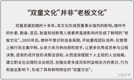 在改革過(guò)程中,樓仲平重視團(tuán)隊(duì)培養(yǎng),在管理上推行民主集中制,從親力親為轉(zhuǎn)向授權(quán)放手,讓更多優(yōu)秀成員參與過(guò)程決策,逐漸形成開(kāi)放的決策話語(yǔ)圈。從而逐漸擺脫個(gè)人主觀的人治獨(dú)裁,建立職業(yè)化治理的法治規(guī)范,在融合更多成員和利益相關(guān)方的意識(shí)、行為和彼此影響下,形成了具有鮮明特征的“雙童文化”。