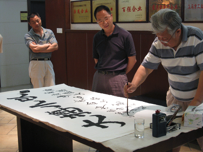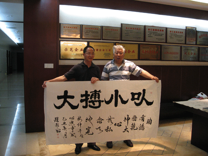 2009年5月12日,國家一級(jí)美術(shù)師醒醉、原名沈芳(教援),應(yīng)公司董事長(zhǎng)樓仲平先生的邀請(qǐng)來我司現(xiàn)場(chǎng)揮毫,迎來眾多書畫愛好者觀看。大師結(jié)合公司董事長(zhǎng)多年以來堅(jiān)持的經(jīng)營理念和公司產(chǎn)品及企業(yè)文化特點(diǎn),揮筆寫下《以小博大》、《胸懷》和《遠(yuǎn)瞻》等名作,并同樓仲平先生現(xiàn)場(chǎng)合影.