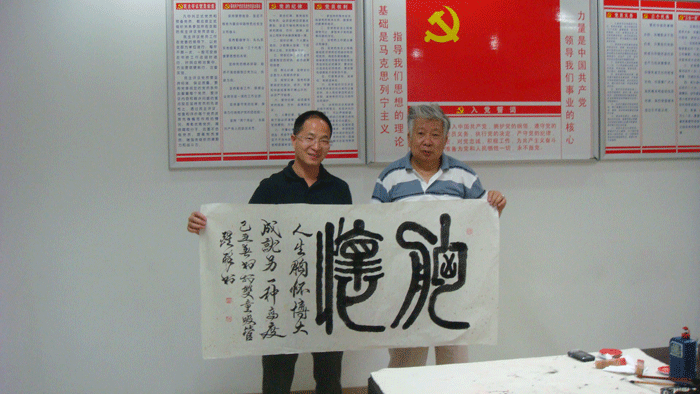 上圖:董事長(zhǎng)樓仲平同醒醉大師就現(xiàn)場(chǎng)作品《胸懷》合影