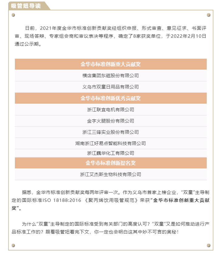 義烏市雙童日用品有限公司給出的答案不是低價競爭,也不是規(guī)模效應(yīng),而是掌握制定標(biāo)準(zhǔn)的話語權(quán)。一路走來,“雙童”先后投入上千萬元巨資,主導(dǎo)起草了吸管產(chǎn)業(yè)的團(tuán)體標(biāo)準(zhǔn)、行業(yè)標(biāo)準(zhǔn)、國家標(biāo)準(zhǔn)和ISO國際標(biāo)準(zhǔn)。