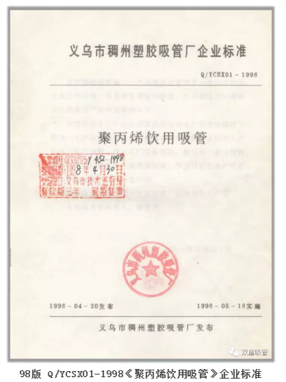 終于在1997年10月,由“雙童”前身的義烏市稠州塑膠吸管廠起草的《聚丙烯飲用吸管》企業(yè)標(biāo)準(zhǔn)順利通過審核,于1998年4月正式發(fā)布,成為吸管行業(yè)最早的產(chǎn)品標(biāo)準(zhǔn)。從此,“雙童”打開了產(chǎn)品在商超場所的銷售渠道,實現(xiàn)了傳統(tǒng)家庭作坊企業(yè)向正規(guī)工廠的轉(zhuǎn)型。
