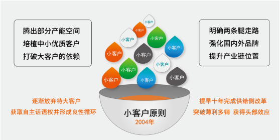 “雙童”第一個(gè)管理案例出現(xiàn)在美國(guó)《商業(yè)周刊》雜志,基于獨(dú)特的發(fā)展環(huán)境“小客戶原則”被提出,并大有成效,成為了中小企業(yè)管理的優(yōu)秀案例。“小客戶原則”是如何產(chǎn)生的?這個(gè)故事要從1997年開始說起。當(dāng)時(shí),雙童利用互聯(lián)網(wǎng)挖掘到五六家國(guó)際大買家的采購訂單,客戶一次下單就要集中所有設(shè)備全力交付,導(dǎo)致優(yōu)質(zhì)中小客戶的訂單遭受嚴(yán)重?cái)D壓,到2002年底,外貿(mào)出口比例一度達(dá)到90%以上,而且每次下單都要求降價(jià),導(dǎo)致規(guī)模不斷擴(kuò)大下利潤(rùn)不增反降。危機(jī)之下,2003年,董事長(zhǎng)樓仲平經(jīng)過長(zhǎng)時(shí)間思想博弈,明確提出“小客戶原則”,要求業(yè)務(wù)員逐步放棄沒有利潤(rùn)的大客戶,騰出產(chǎn)能空間培植日本和歐盟的中小客戶,拓展國(guó)內(nèi)高端市場(chǎng)和個(gè)性化定制,形成“兩條腿走路”,牢牢掌握了雙童經(jīng)營(yíng)的主動(dòng)權(quán)。