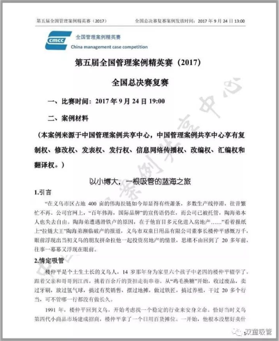 其中浙江工業(yè)大學(xué)和南京大學(xué)采編的管理案例分別被評(píng)為2016年和2017年度全國(guó)管理案例的百優(yōu)案例。在2017年全國(guó)管理案例精英賽中,《以小博大,一根吸管的藍(lán)海之旅》被指定為總決賽的PK案例。截至目前,以雙童為主題的案例進(jìn)入到國(guó)家案例庫的數(shù)量就有十多件。