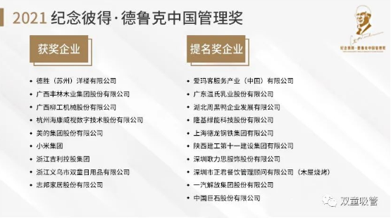 來自美國(guó)塑料新聞、法國(guó)、德國(guó)、瑞典等學(xué)術(shù)機(jī)構(gòu)也紛紛以全新經(jīng)濟(jì)視角對(duì)雙童的經(jīng)營(yíng)模式進(jìn)行挖掘和提煉,并在2021年獲得管理界最權(quán)威的“彼得·德魯克管理獎(jiǎng)”。