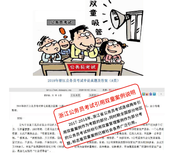 2015年以來,雙童案例逐漸被各大院校MBA大量采用。2016年,雙童案例出現(xiàn)在蘭州大學(xué)附中期末考試的試題上,受到《人民網(wǎng)》的關(guān)注和報(bào)道。2017年,雙童堅(jiān)守實(shí)業(yè)的工匠精神成為浙江企業(yè)標(biāo)桿案例被列入浙江省公務(wù)員考題。2018年3月中歐商學(xué)院到雙童采集長(zhǎng)達(dá)10頁的案例發(fā)布。2019-2020年,雙童案例連續(xù)兩年被浙江省初中德育課程教材《浙江人》所收錄,為廣大學(xué)生的案例教學(xué)提供生動(dòng)詳實(shí)的市場(chǎng)范本。在社會(huì)案例傳播推動(dòng)下,全國(guó)各地的學(xué)生陸續(xù)來雙童社會(huì)實(shí)踐,并成為“浙江省中小學(xué)社會(huì)實(shí)踐教育”基地。
