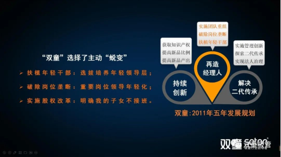 2010年,樓仲平在理解人性活力的“自然遞減”的現(xiàn)象以及經(jīng)理人老化自然規(guī)律后,下定決心通過《雙童五年發(fā)展規(guī)劃》的組織變革來實施解決“經(jīng)理人老化”問題:明確扶植年輕干部,選拔培養(yǎng)優(yōu)秀的年輕領(lǐng)導(dǎo)層,解決二代傳承接班等問題。