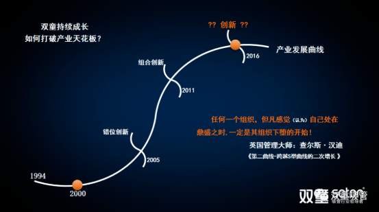 “雙童”從2011年底啟動的“再造經(jīng)理人”組織變革,于2015年底全面完成。重新組建的“雙童”行政團(tuán)隊在當(dāng)時平均年齡不到30歲,核心團(tuán)隊的大部分都是90后,新生代員工已成為“雙童”的核心管理骨干。借由2011年的五年發(fā)展規(guī)劃,“雙童”實現(xiàn)了現(xiàn)代化企業(yè)組織變革,解決了作為傳統(tǒng)企業(yè)的“老、大、難”問題。