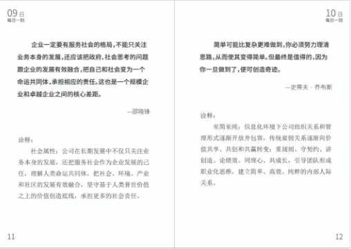 每天早上八點(diǎn)是“雙童”的晨讀環(huán)節(jié),“雙童”所有員工都會(huì)捧著一本小冊(cè)子進(jìn)行誦讀。其實(shí)這本書就是“雙童”的企業(yè)文化叢書——《每日一則》。