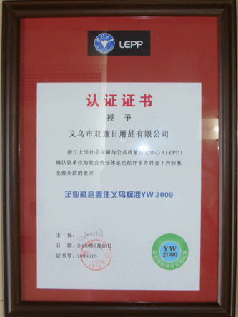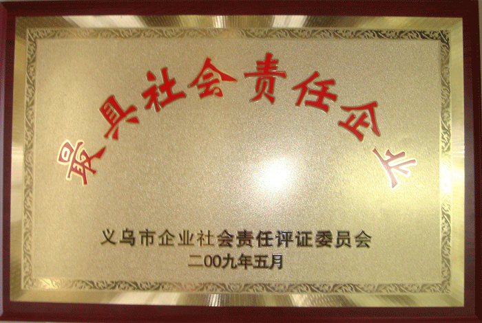 5月22日下午,義烏市總工會在北苑街道多功能廳舉行由浙江大學(xué)社會保障與公共政策研究中心(LEPP)確認(rèn)的最具社會責(zé)任企業(yè)頒獎儀式,吳森民副市長出席會議并作了重要講話。我司經(jīng)評審符合企業(yè)社會會責(zé)任義烏標(biāo)準(zhǔn)YW2009全部條款的要求,并被授予“最具社會責(zé)任企業(yè)“稱號。