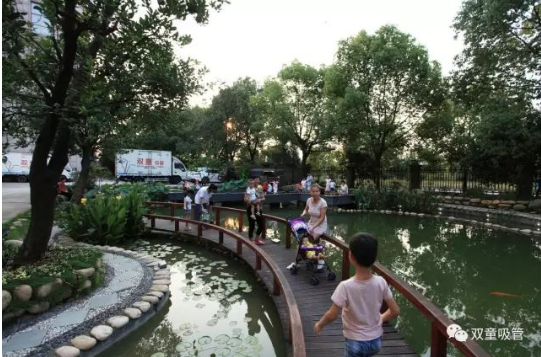 在一天忙碌的工作結束后,“雙童”人喜歡漫步在九曲橋邊,家屬們也常常帶著孩子來這里乘涼聊天,湖邊河卵石的小路上到處坐滿了人,這里的好風光給大家?guī)砹藵M滿的幸福感!