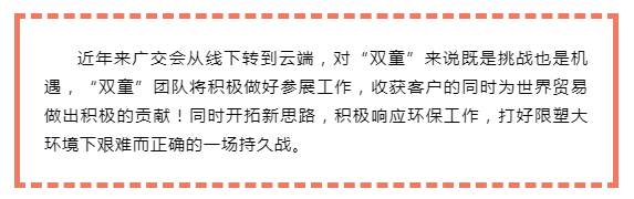 為了將環(huán)境友好型產(chǎn)品推向全球,為國際環(huán)保事業(yè)出一份力。本次廣交會(huì)“雙童”主推的是可食用淀粉吸管、聚乳酸可降解吸管以及紙吸管等符合限塑大環(huán)境的產(chǎn)品,并且積極引導(dǎo)客戶選購環(huán)保產(chǎn)品。