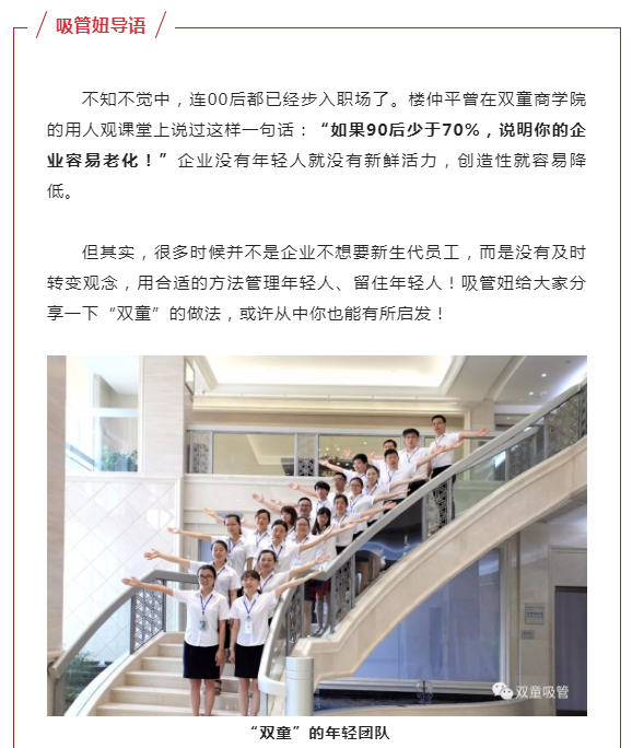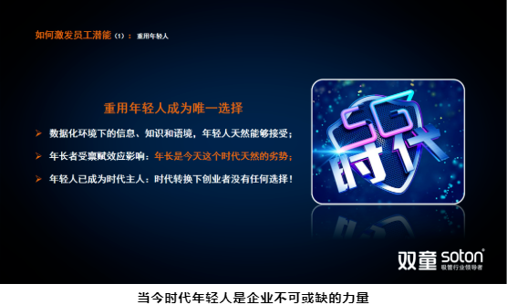 新生代員工的成長環(huán)境塑造了他們的性格,認知方式也會不同于其他時代的人。一旦老板與員工的認知不同,那就很難達成思想同頻,自然會有沖突。這些沖突正是“年輕人不好管”這種觀念產(chǎn)生的源頭。“雙童”用這個方式解答這一沖突:用年輕人去管理年輕人,敢于授權(quán)給年輕人,運用新生代的力量突破巨變時代下企業(yè)發(fā)展的局限。