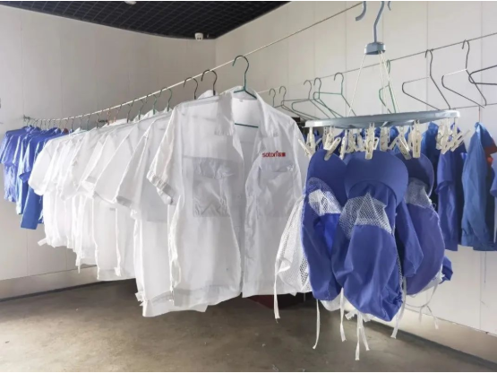首先,是清洗場(chǎng)所?!半p童”的工服洗衣房就和車間清洗間配置在一起,既聯(lián)通車間,提高工服來(lái)回運(yùn)送的效率,又能夠保持相對(duì)獨(dú)立,不影響生產(chǎn)。這里的洗衣工具齊全,既有機(jī)洗區(qū)域,也有供斷電情況使用的手洗池。