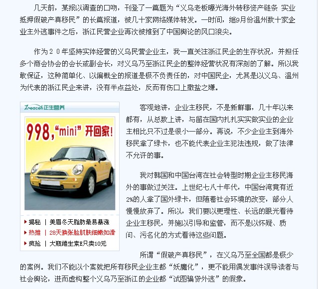 幾天前,某報以調(diào)查的口吻,刊登了一篇題為“義烏老板曝光海外轉(zhuǎn)移資產(chǎn)鏈條 實業(yè)抵押假破產(chǎn)真移民”的長篇報道,被幾十家網(wǎng)絡(luò)媒體轉(zhuǎn)發(fā)。一時間,繼9月份溫州數(shù)十家企業(yè)主外逃事件之后,浙江民營企業(yè)再次被推到了中國輿論的風口浪尖。