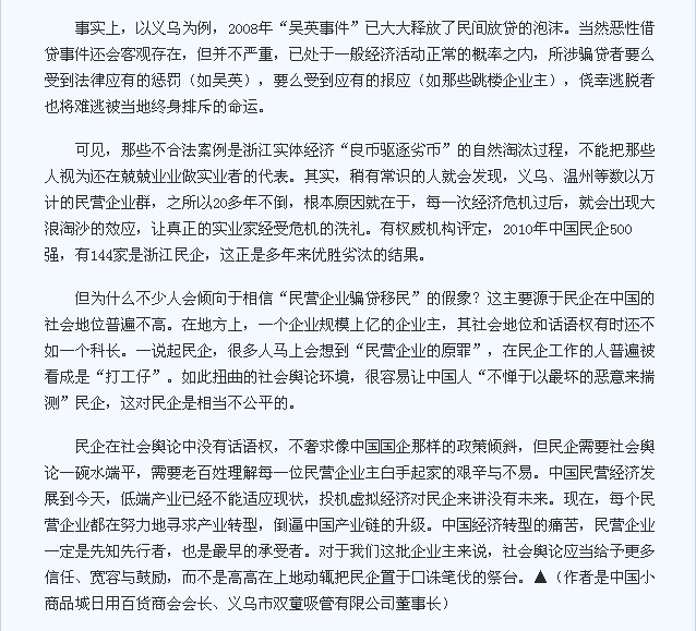 作為20年堅持實體經(jīng)營的義烏民營企業(yè)主,我一直關(guān)注浙江民企的生存狀況,并擔任多個商會協(xié)會的會長或副會長,對義烏乃至浙江民企的整體經(jīng)營狀況有深刻的了解。所以我敢保證,這種簡單化、以偏概全的報道是極不負責任的,對中國民企,尤其是以義烏、溫州為代表的浙江民企來講,沒有半點益處,反而有傷口上撒鹽之嫌。